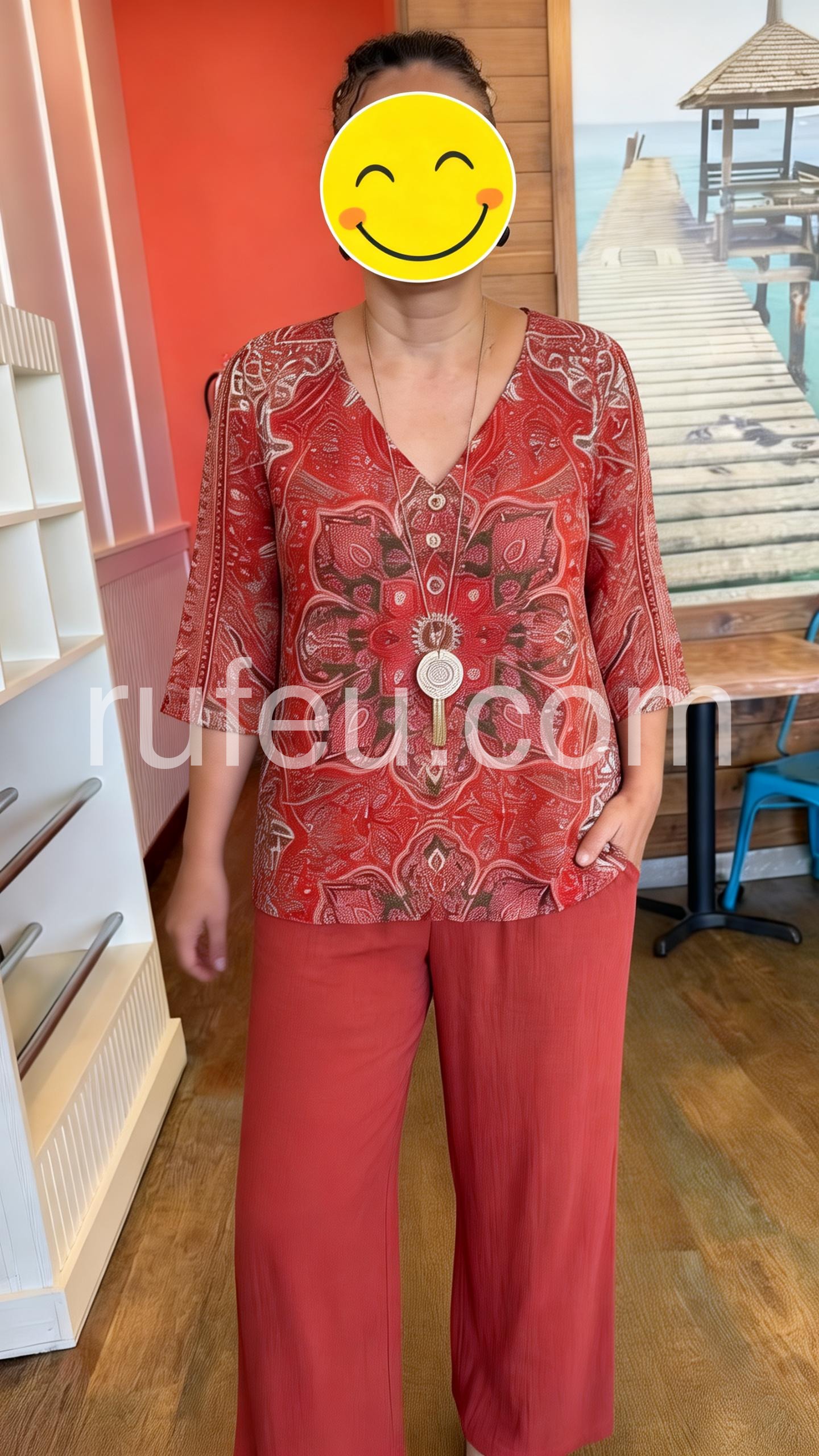 This coordinated set features a V-neck top with a bold mandala print and matching solid wide-leg pants. The relaxed fit ensures all-day comfort. Soft fabric perfect for warm weather. Ideal for casual outings or stylish days out. Effortlessly chic with a bohemian flair.