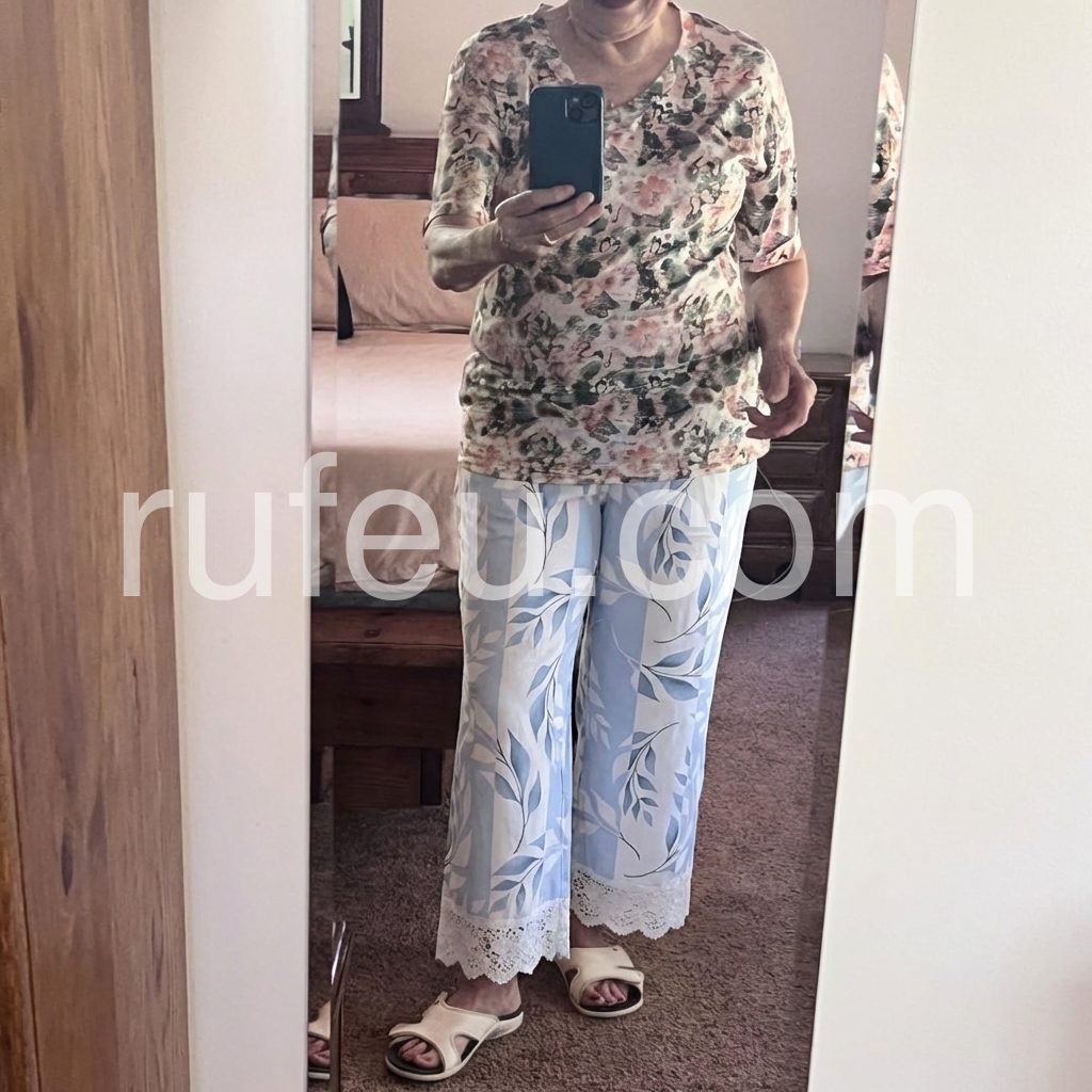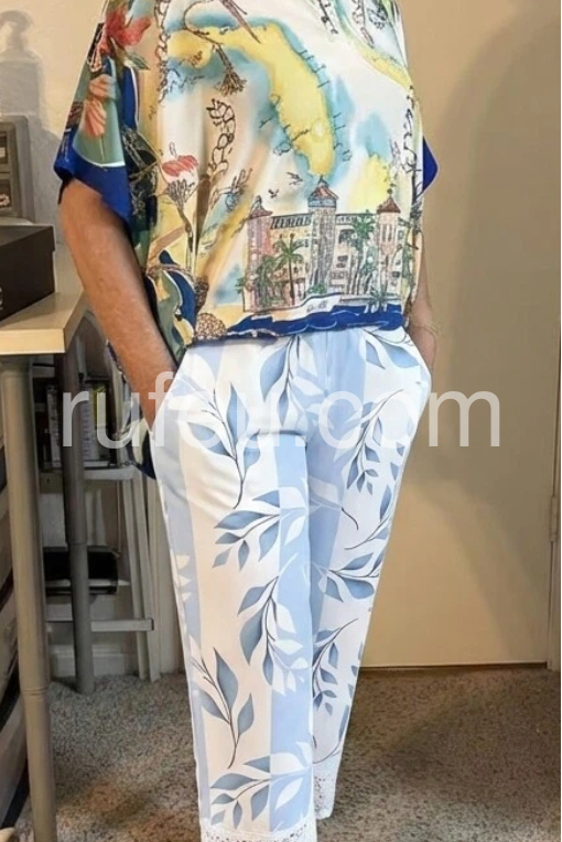 These flowy wide-leg pants feature a soft blue and white leaf pattern with a delicate lace hem. Elastic waistband and side pockets for comfort. Lightweight fabric perfect for warm days. Ideal for beachwear or casual summer styles. Elegant and breezy design.