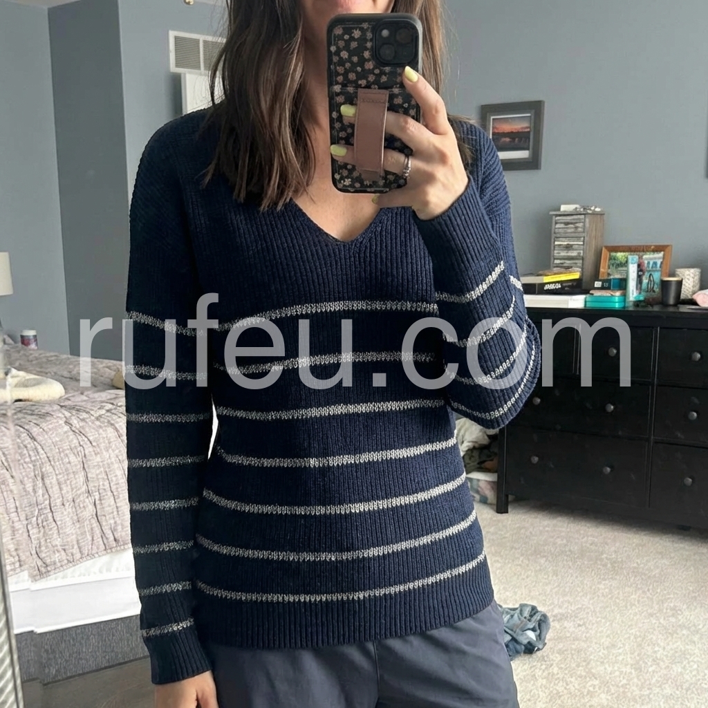 Stay stylish and warm with our Groovy V-Neck Striped Print Navy Sweater. The v-neck adds a touch of elegance while the striped print adds a trendy flair. Made with high-quality materials, this sweater is perfect for any occasion. Upgrade your wardrobe and stay cozy this season.