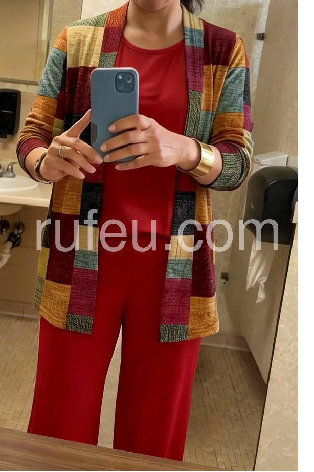 This coordinated outfit features a solid red top and wide-leg pants paired with a vibrant patchwork cardigan. The colorful, geometric design adds a modern touch. Comfortable and chic for casual or semi-formal wear. Perfect for autumn days or stylish outings. Effortlessly elegant with a pop of personality.