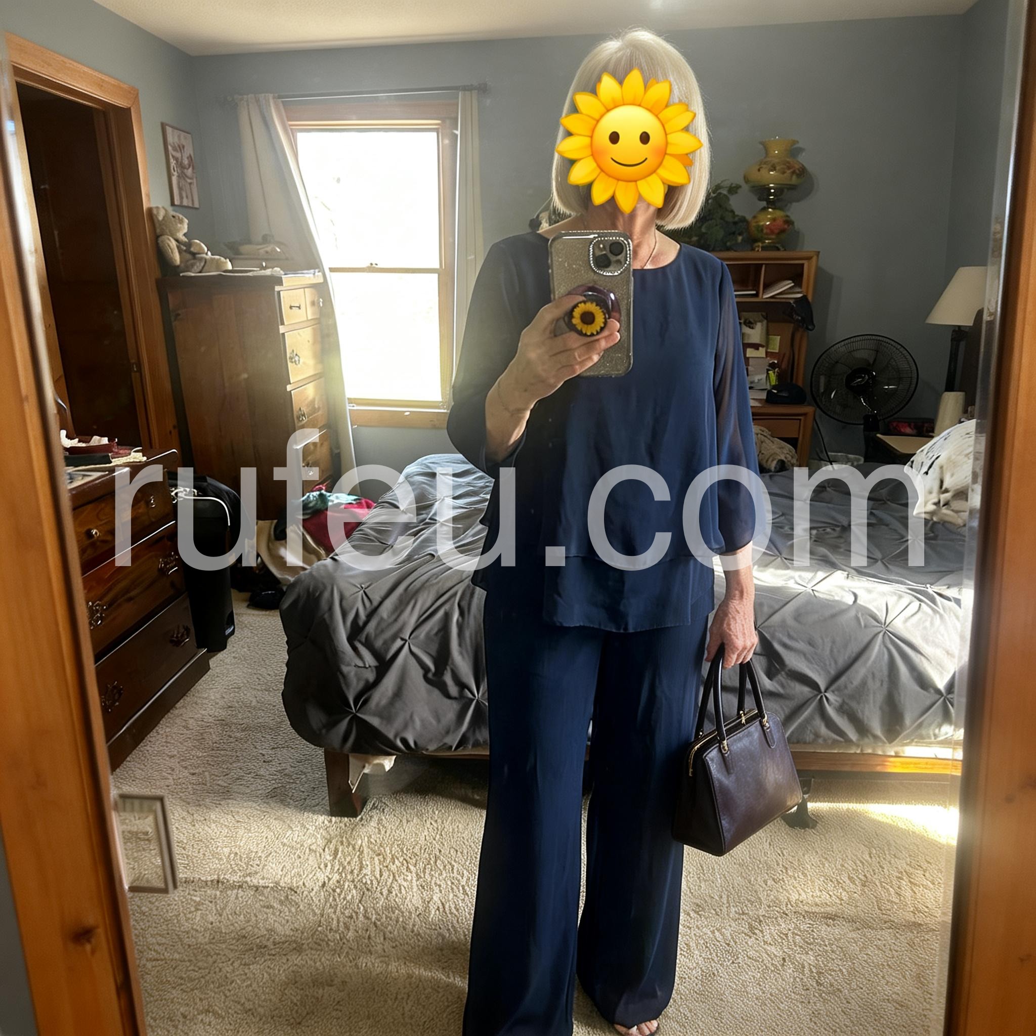 This two-piece outfit is effortlessly elegant! The navy color is so classy, and the flowy top adds a lovely touch. Perfect for dinner parties or casual outings.