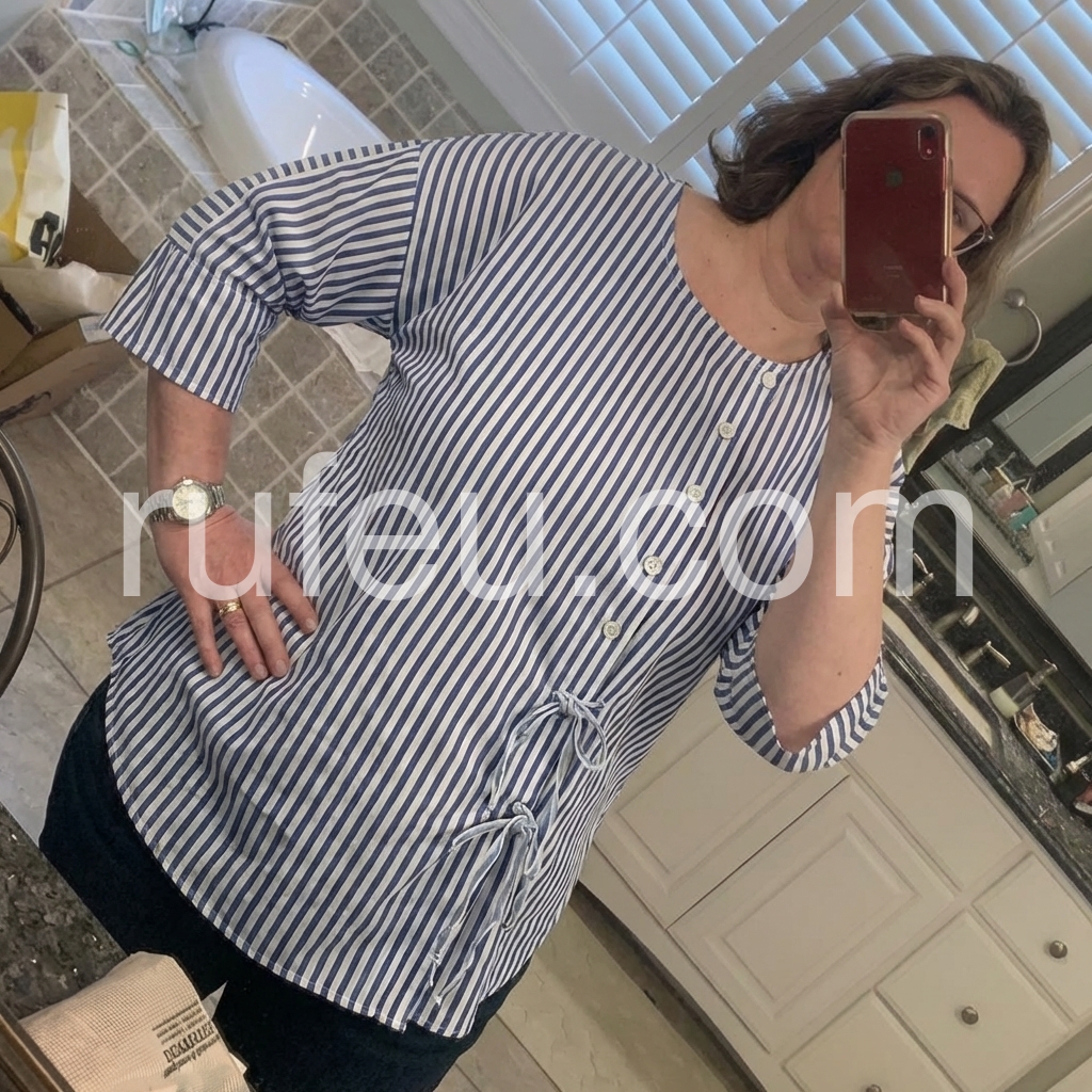 This loose-fit top features vertical blue and white stripes with a clean, casual look. Round neckline and front button-down design for easy wear. Side ties add a feminine touch. Three-quarter sleeves with rolled cuffs. Perfect for everyday comfort and effortless style.