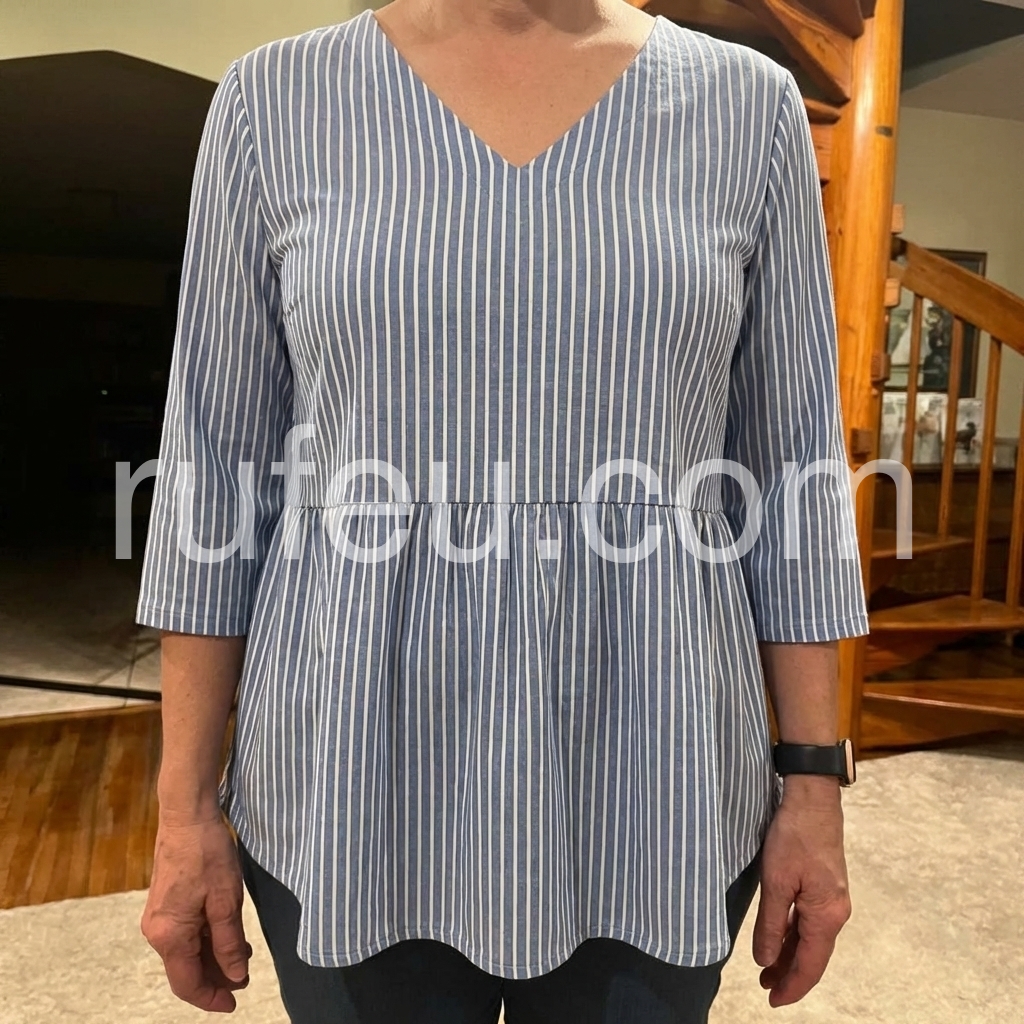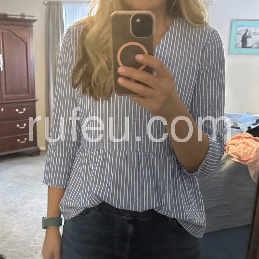 This relaxed-fit tunic features vertical blue and white stripes with a soft V-neckline. Three-quarter sleeves with rolled cuffs for a casual look. Gathered waist creates a flattering silhouette. Lightweight fabric perfect for everyday wear. Ideal for pairing with jeans or leggings.