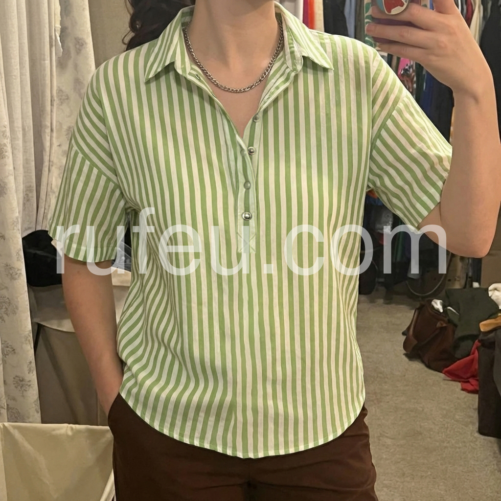 Green White Stripe Collared Half Placket Blouse