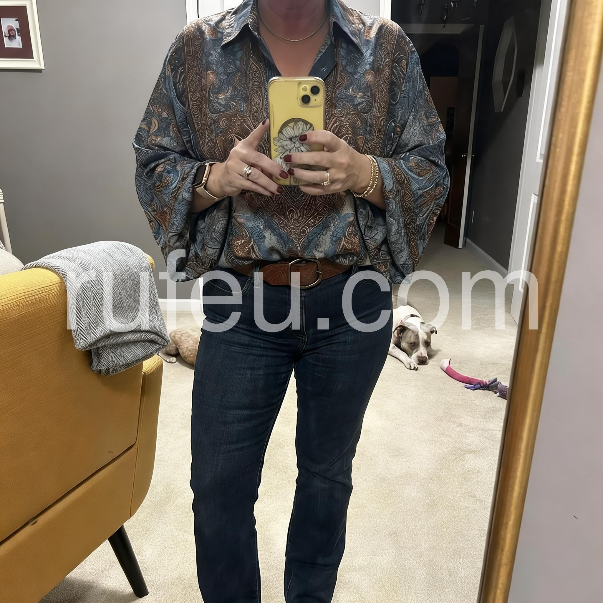 Crafted from premium silk, this bohemian blouse showcases an intricate blue print that captures effortless elegance. The relaxed silhouette and flowing fabric create natural movement, making it ideal for layering or wearing solo. Perfect for transitional seasons, this versatile piece pairs seamlessly with denim, linen trousers, or skirts. The breathable silk construction ensures comfort throughout the day while maintaining a refined, polished appearance. A timeless addition to any wardrobe seeking understated sophistication with artistic flair.