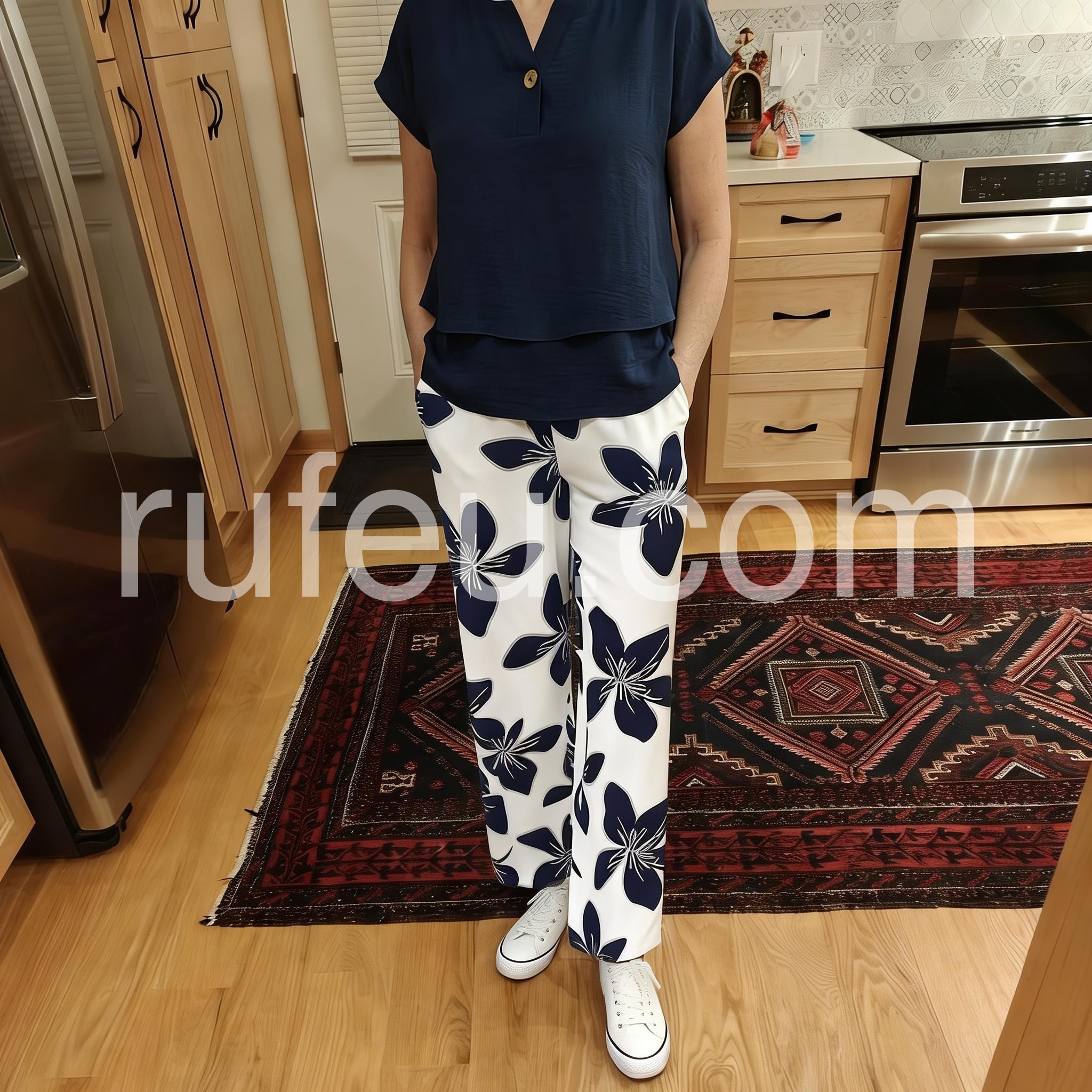 This outfit is a head-turner. The contrast between the solid dark blue top and the bold flower pattern on the pants is stunning. It feels like high-end boutique clothing but at a fraction of the cost. Super comfy for all-day wear.