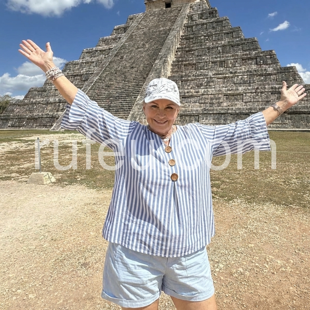 This three-quarter sleeve top features vertical blue and white stripes. V-neckline with front wooden buttons for a relaxed look. Flared ruffle cuffs add delicate detail. Lightweight fabric perfect for casual wear. Ideal for pairing with jeans or skirts.