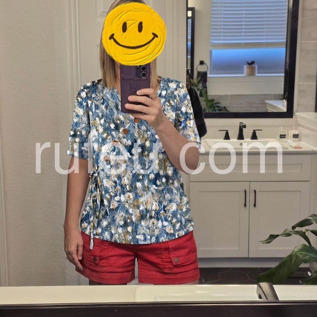 This blouse blends artistic watercolor florals with a flattering wrap silhouette.