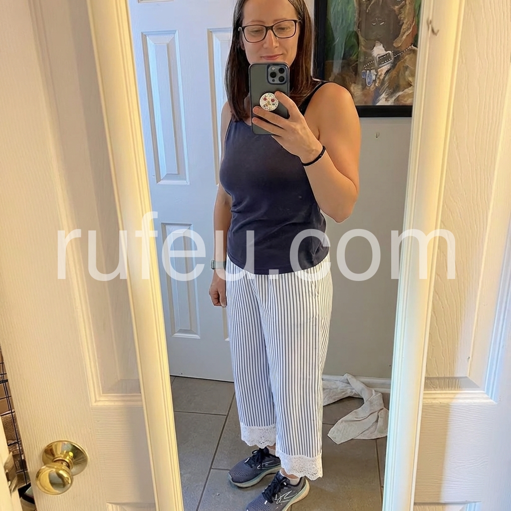 These relaxed-fit pants feature vertical blue and white stripes with a delicate lace trim at the hem. Elastic waistband and side pockets for comfort. Lightweight fabric perfect for warm weather. Ideal for beach days or casual outings. Effortlessly stylish and breezy.