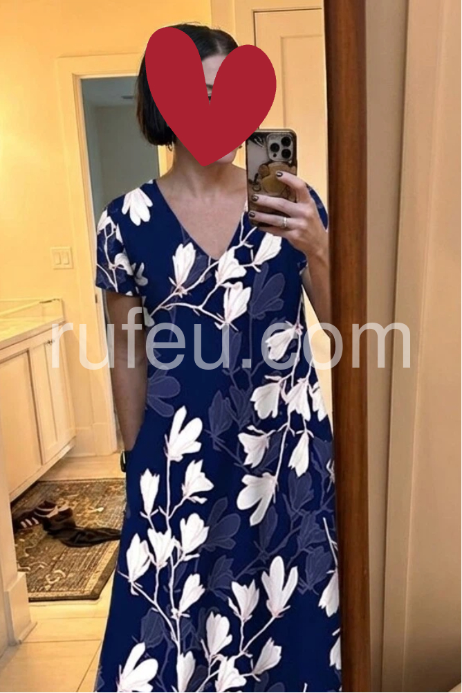 This flowing midi dress features a deep navy base with white floral prints. V-neckline and short sleeves for a flattering fit. Side pockets add practicality and ease. Lightweight fabric perfect for summer days. Ideal for beach outings or casual gatherings.
