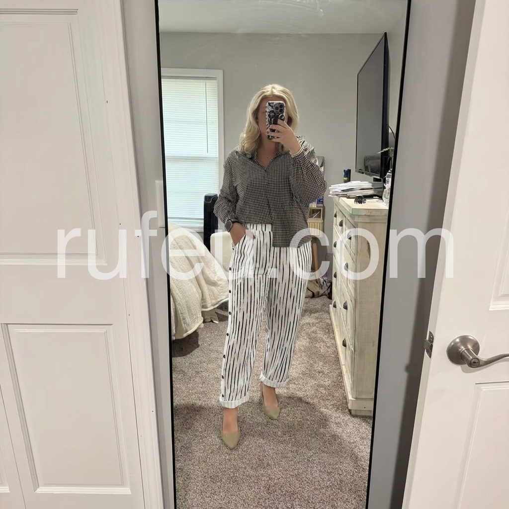 I am usually hesitant about buying pants online, but these exceeded my expectations. They hang beautifully and do not cling. The striped print is very modern and chic.