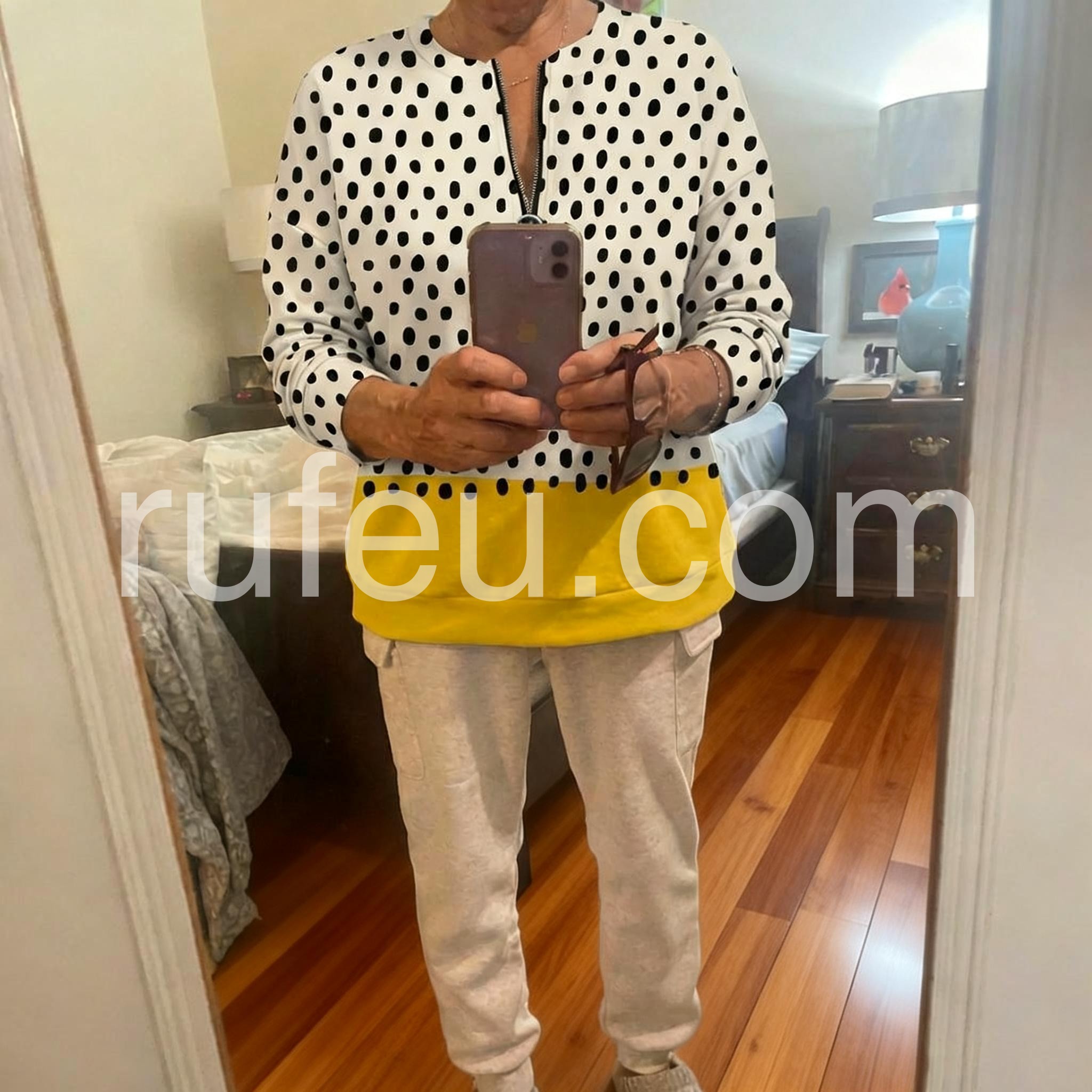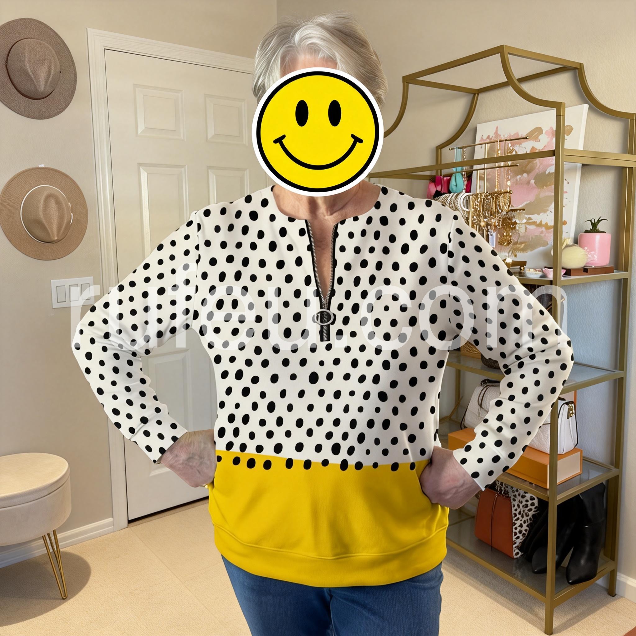 I absolutely love this top! The black and white polka dots are classic, and the yellow color block at the bottom adds such a fun pop of color. The zipper at the neckline is a cute detail. Fits true to size!