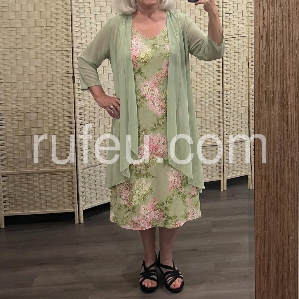 This soft floral dress features a light green base with pink and white blossoms. Paired with a matching sheer duster for a layered look. V-neckline and relaxed fit perfect for warm days. Ideal for garden parties or casual outings. Fresh and feminine style.