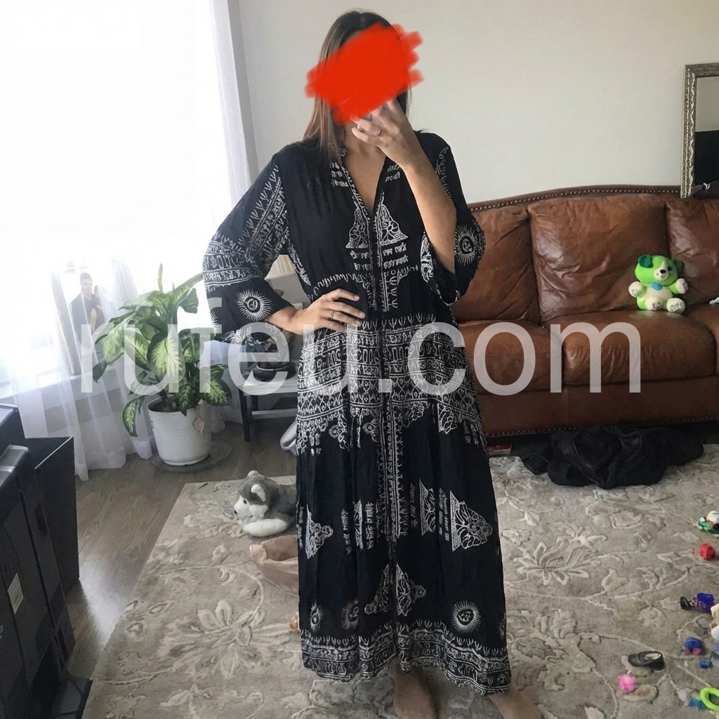 I’m obsessed with this black and white printed dress! The detailed ethnic patterns add so much character, and the oversized silhouette is both cozy and stylish. The fabric is soft and breathable, ideal for warm weather. I’ve worn it to brunch and a beach picnic, and it always gets compliments. It’s the ultimate piece for embracing a laid-back, boho vibe!